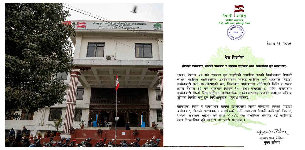 ‘तोकिएको मिति र समयभित्र आफ्नो उम्मेदवारी फिर्ता नलिएमा त्यस्ता विद्रोही उम्मेदवार, निजको प्रस्तावक र समर्थकको पार्टी सदस्यता नेपाली कांग्रेसको विधान, २०१७ (संशोधन सहित) को धारा ४ (१३) (ग) बमोजिम समाप्त भई पार्टीबाट स्वतः निष्काशित हुने व्यहोरा जानकारी गराइन्छ’, विज्ञप्तिमा लेखिएको छ ।