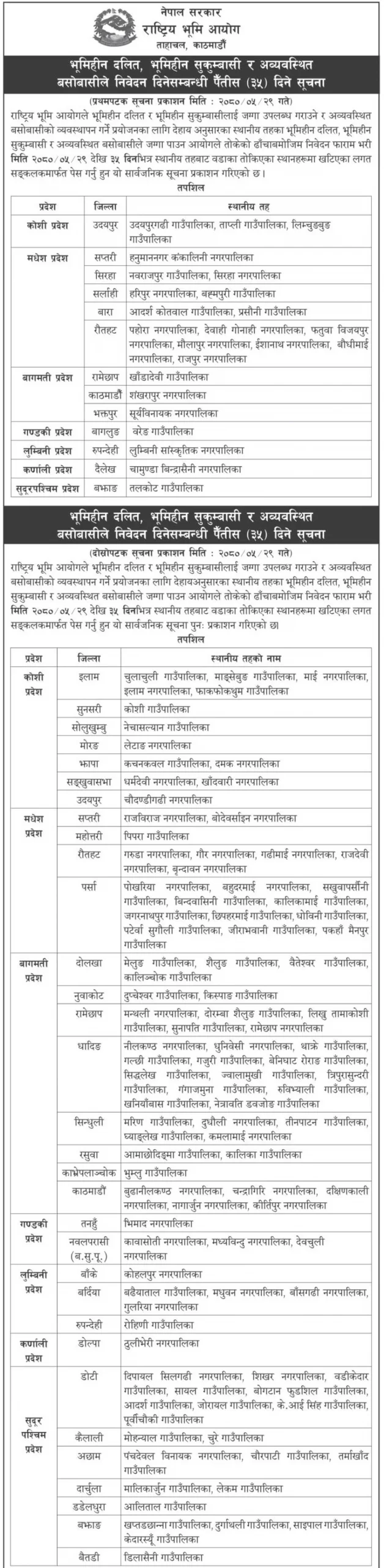 आज एक सूचना जारी गर्दै ३५ दिन भित्र भूमिहीन दलित, भूमिहीन सुकुम्बासी र अव्यवस्थित बसोबासीलाई निवेदन दिन आयोगले आग्रह गरेको हो ।