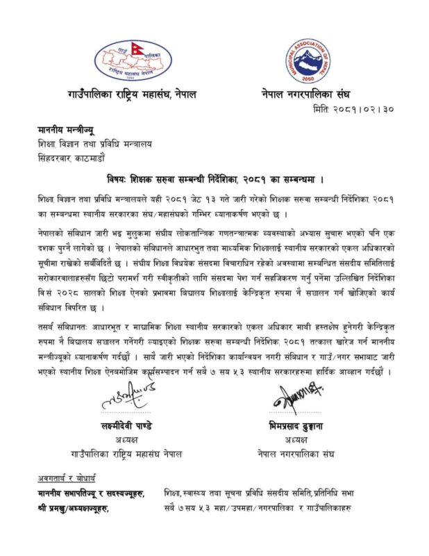 काठमाडौं- नेपाल नगरपालिका संघ र गाउँपालिका राष्ट्रिय महासंघले शिक्षा मन्त्री सुमना श्रेष्ठले जारी गरेको शिक्षक सरुवा सम्वन्धि मापदण्ड नमान्ने घोषणा गरेका छन् ।