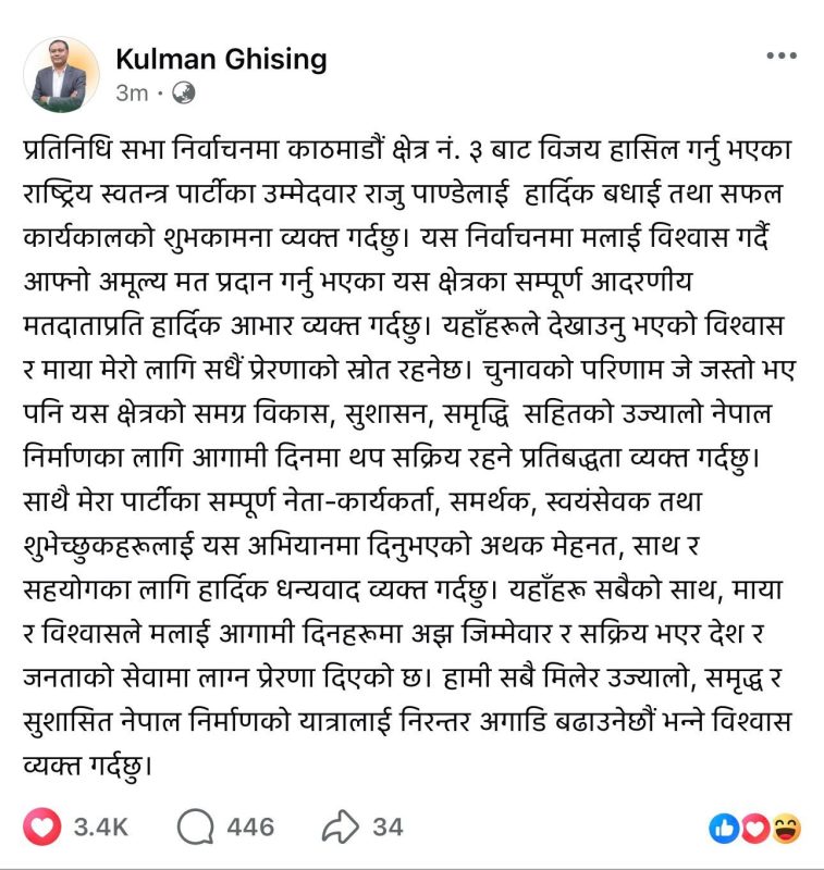 आफ्ना नेता, कार्यकर्ता र समर्थकहरूलाई धन्यवाद दिँदै घिसिङले जनताको माया र विश्वास नै आफ्नो लागि मुख्य प्रेरणाको स्रोत रहेको उल्लेख गरेका छन्।