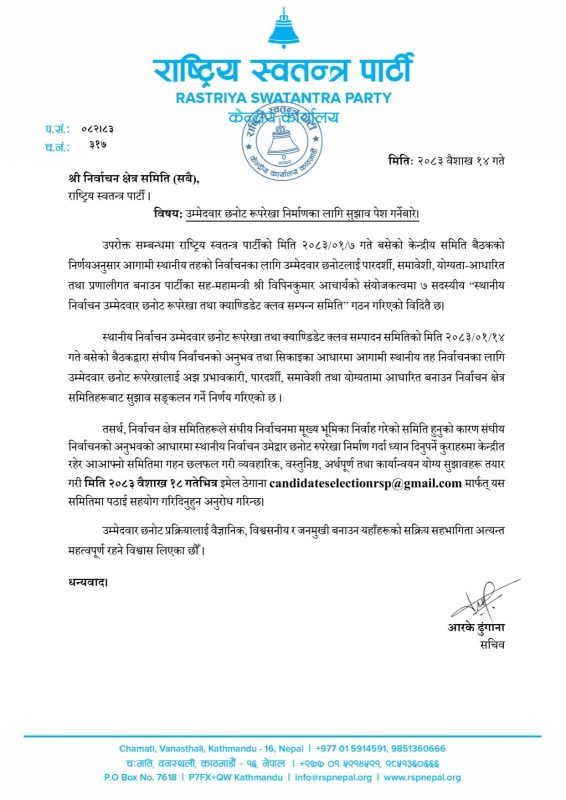स्थानीय तहका उम्मेदवार छनोटका लागि रास्वपाले माग्यो सुझाव